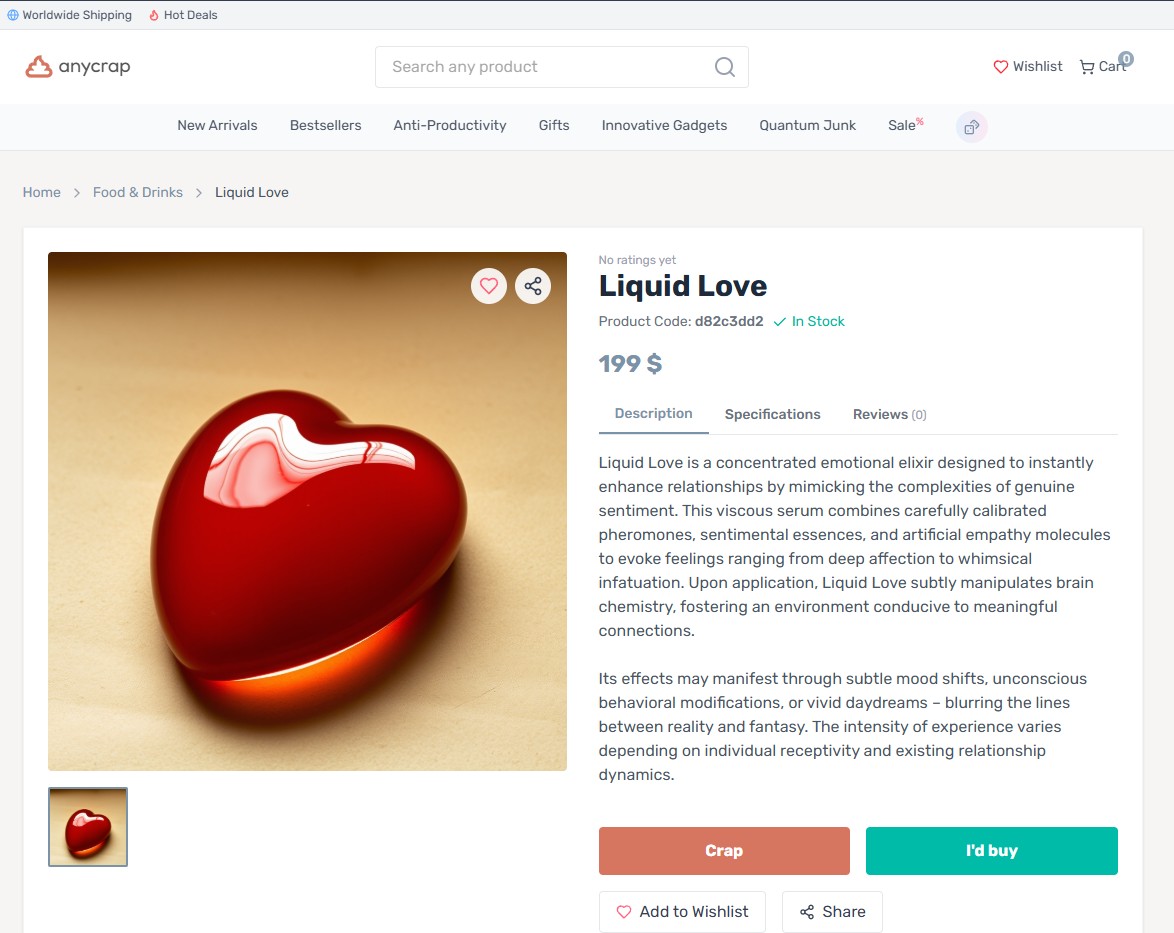 這個網站並非真正銷售商品,而更像一場大型的社會實驗與行為藝術,充滿了黑色幽默與惡趣味。無論你輸入「一杯眼淚」、「會飛的烏龜」還是更抽象的「禮拜一的憂鬱」,AnyCrap.shop 都能一本正經地為你「創造」出實體商品,並標上一個看似合理的價格。