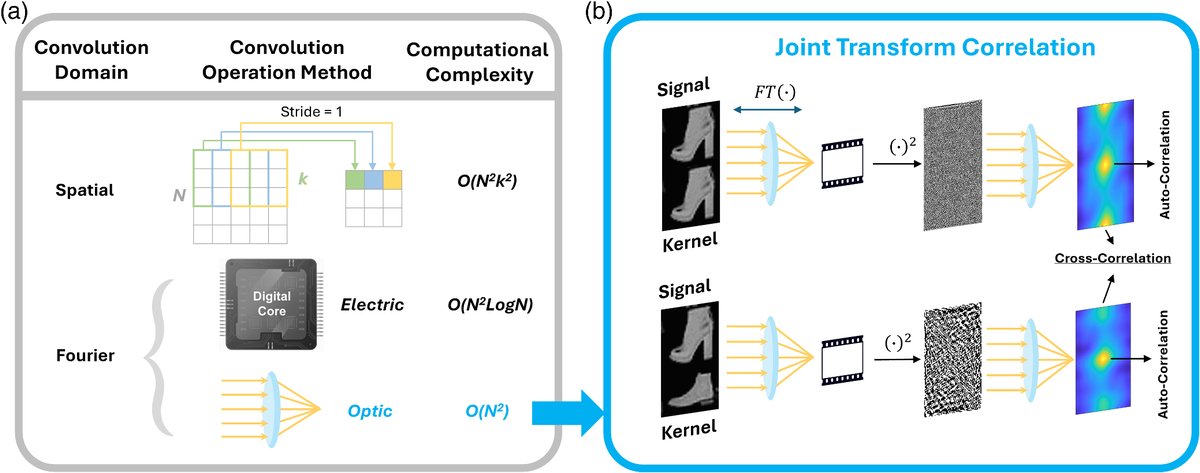(Figure Credit :Advanced Photonics, Vol. 7, Issue 5 ,上面這張圖是論文中提到的,執行卷積操作的概念構成了許多機器學習演算法的基礎。以左圖 (a) 來看,SC、FEC 和 FOC 在計算複雜性方面,使用光學晶片可以降低複雜度,可以藉由 FOC 降低耗電與成本,光子製程在此能實現基於晶片的解決方案。右邊圖的 (b) 的部分,FOC 可以藉由光學去生成組合輸入訊號和核心的傅里葉轉換,並進行強度偵測,在訊號和核心之間產生相關性。如果和經典的 4F 光學系統相比,這種新的方法 JTC 採用更少的元件,簡化了結構,並提高系統穩定性,更重要的,是降低了製造的難度。)