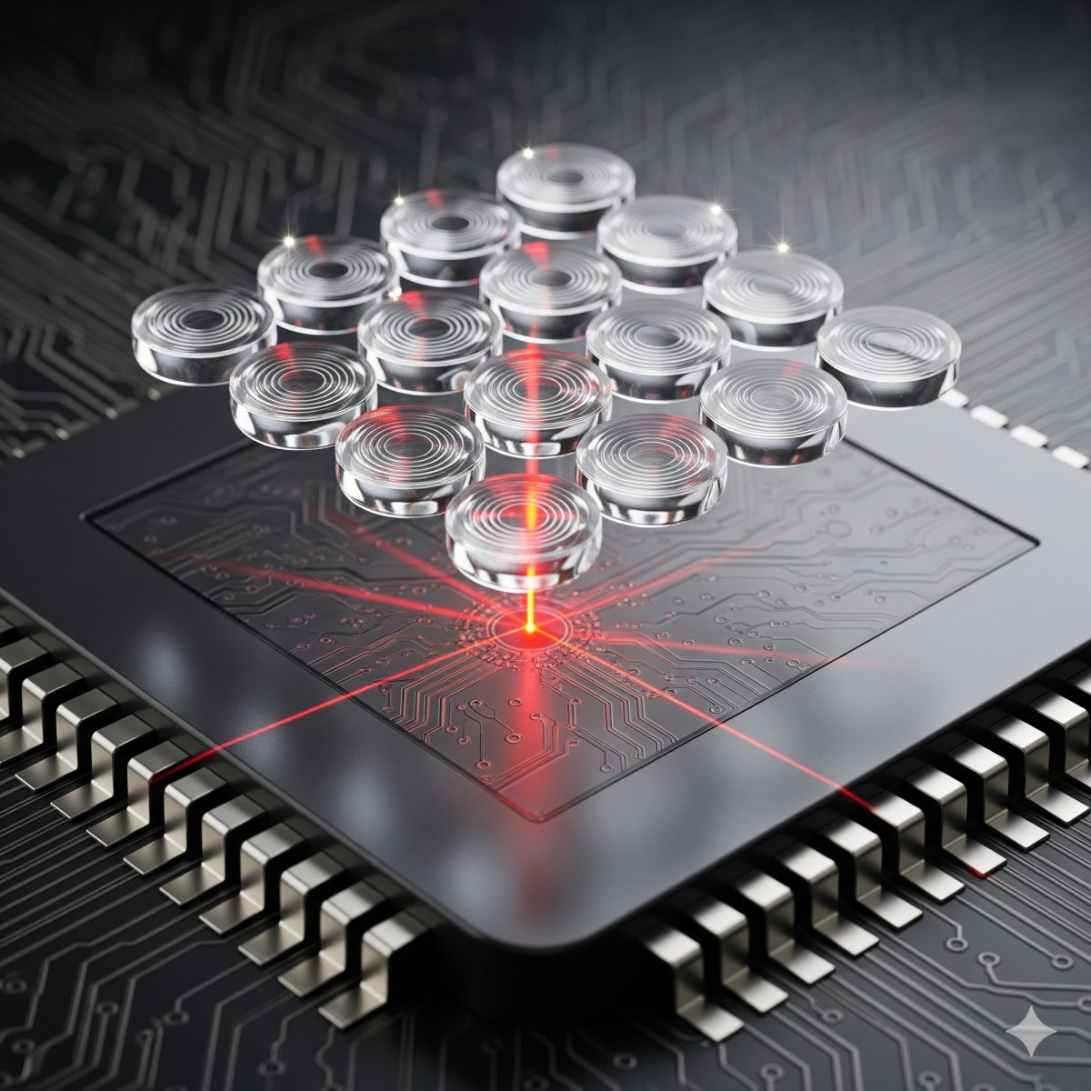 光學卷積:晶片上整合了雷射以及數組微小的「菲涅耳透鏡」(Fresnel lenses)。這些二維透鏡的尺寸僅有人類髮絲的一小部分,可以直接在電路板上製造。雷射光訊號穿過這些特殊設計的透鏡陣列,便能以極低的功耗完成複雜的卷積運算。