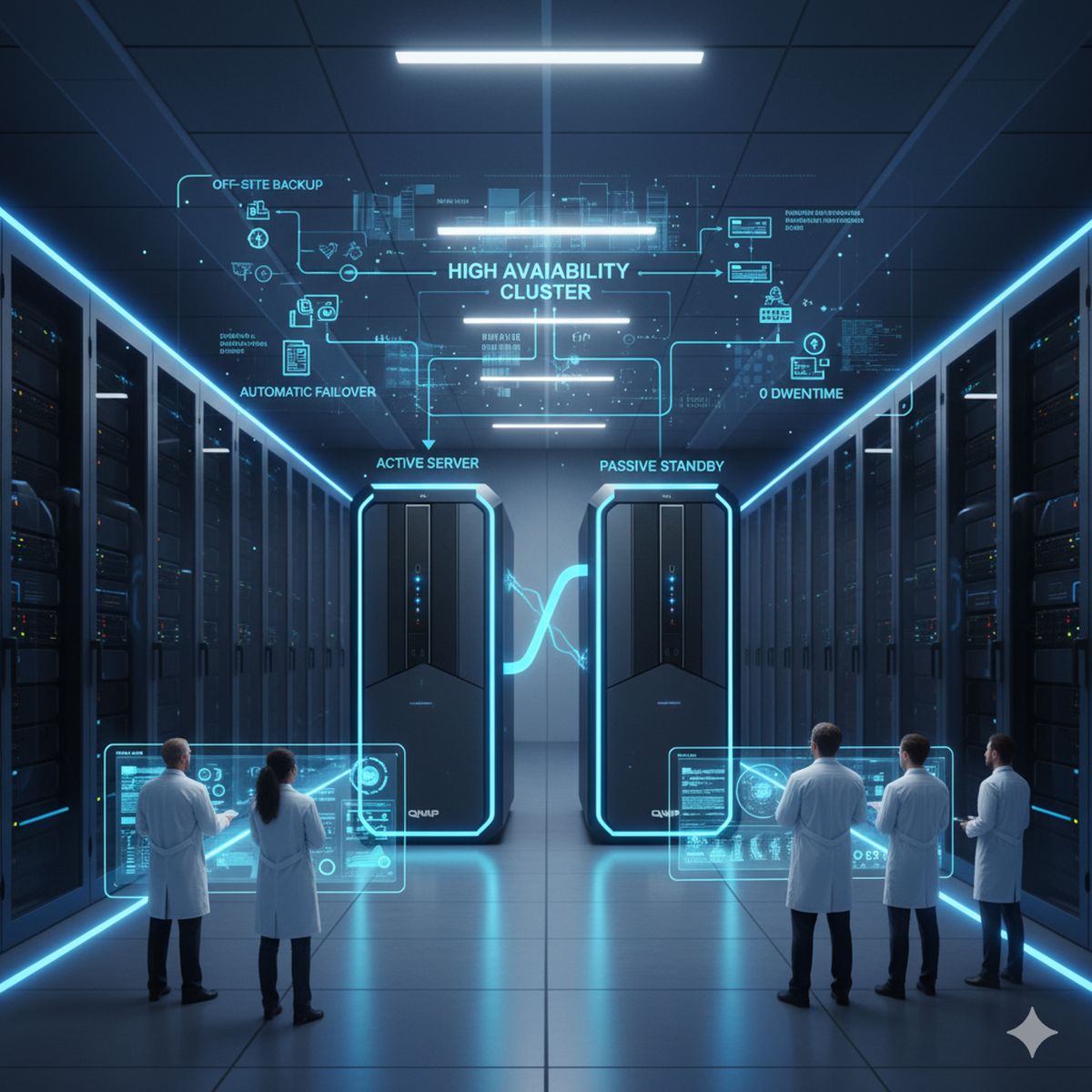 以業界知名的網路儲存設備(NAS)大廠 QNAP 為例,其提供了相當成熟的高可用性解決方案。比方說最簡單的,透過建立一個由兩台 QNAP NAS 組成的 HA 叢集(High Availability Cluster),一台作為主要運作的「主動伺服器」,另一台則作為隨時待命的「被動伺服器」。當主動伺服器發生任何非預期的故障時,被動伺服器能在極短的時間內自動接管所有服務,確保企業營運不中斷。