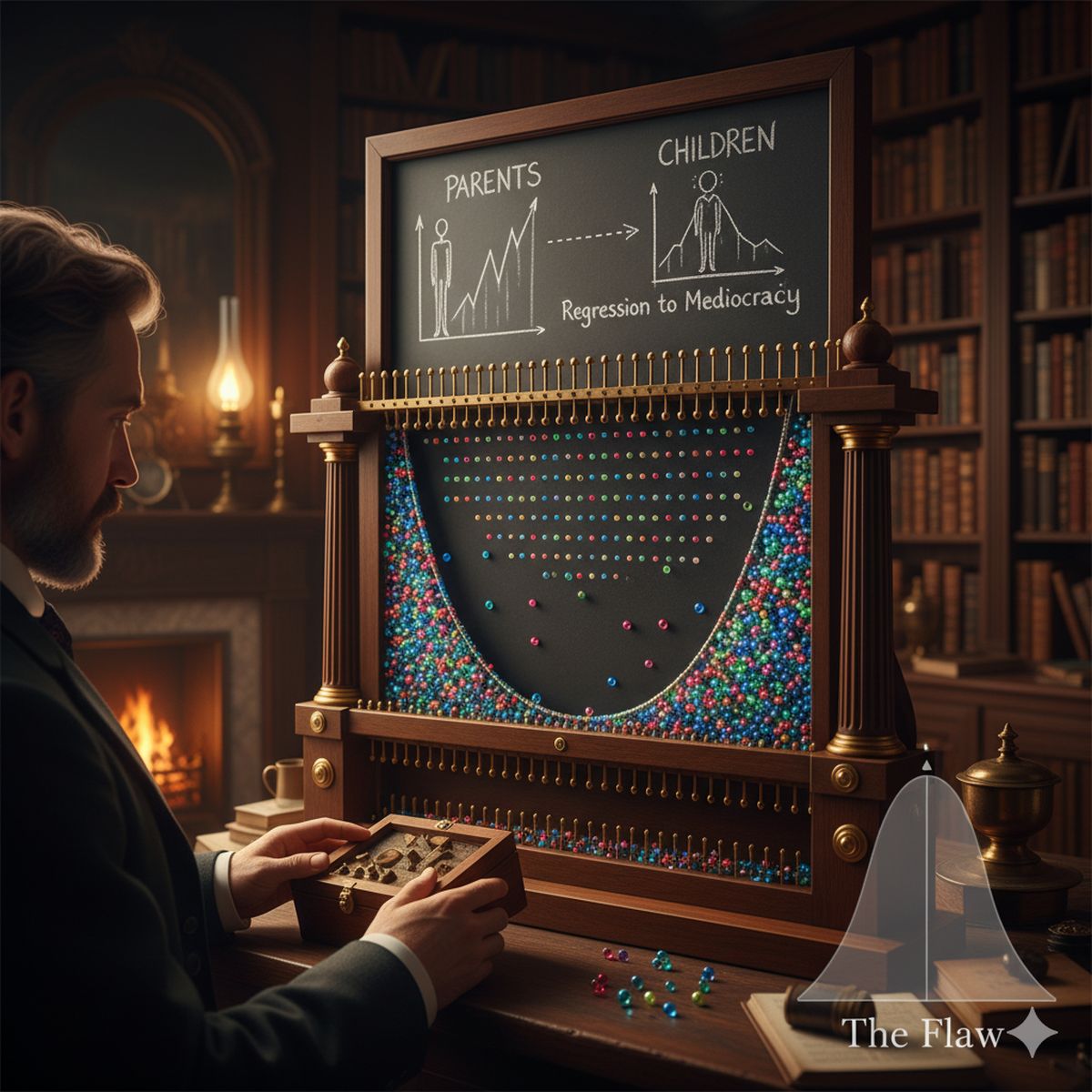 然而,他很快發現一個致命漏洞:如果遺傳只是隨機碰撞的累積,人類的身高分佈應該會一代代變寬,出現三米高的巨人和一米二的侏儒。但現實並非如此。經過八年的苦思,他發現了一個現象:「向平庸回歸」(regression towards mediocracy),也就是我們今天所說的「均值回歸」(regression to the mean)。
