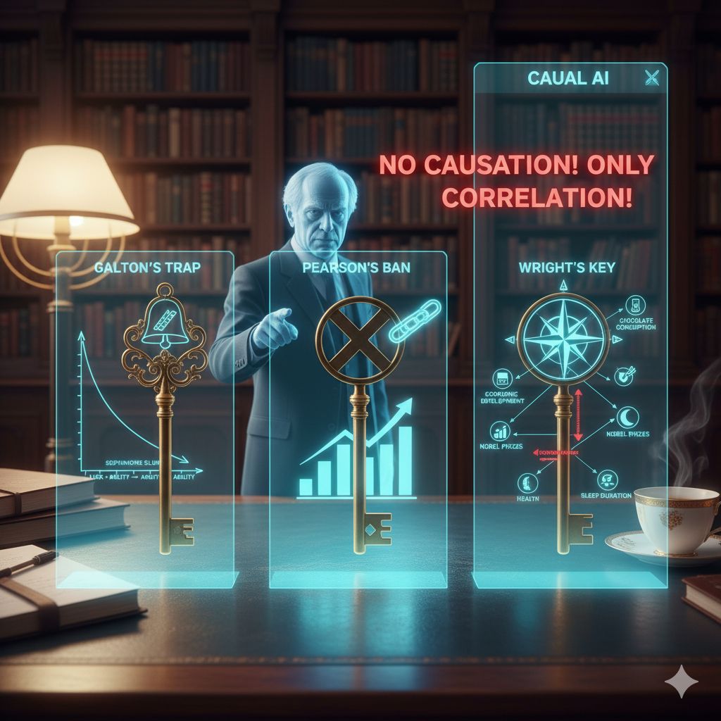 高爾頓的學生卡爾·皮爾遜(Karl Pearson)將這條路走到了極致。他認為因果是「形而上學」,是科學應該拋棄的舊思維,並宣稱「因果不過是相關性達到100%的特例」。在他的強力推動下,統計學的大門對「因果」一詞關閉了近半個世紀。科學家們被禁止在論文中寫「A導致B」,只能說「A與B呈現顯著相關」。
