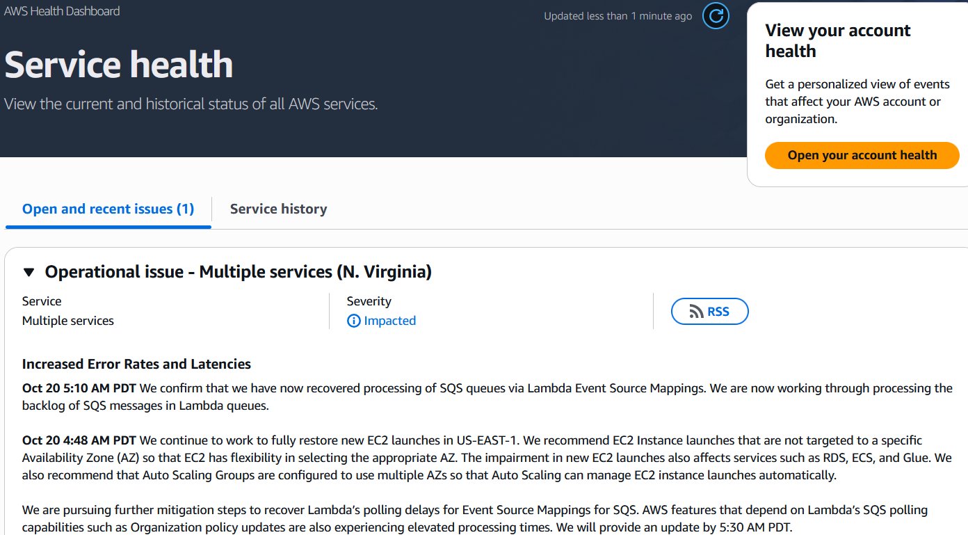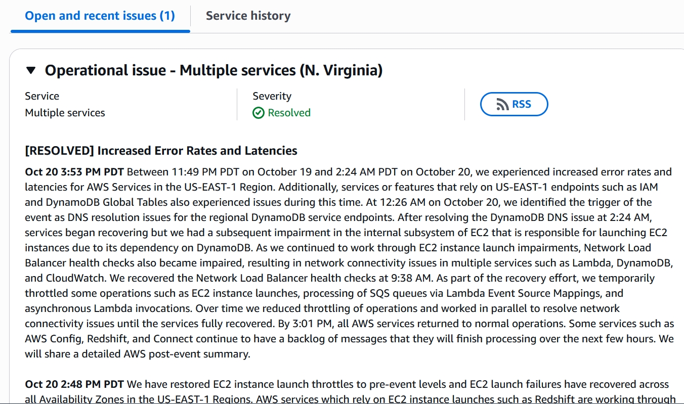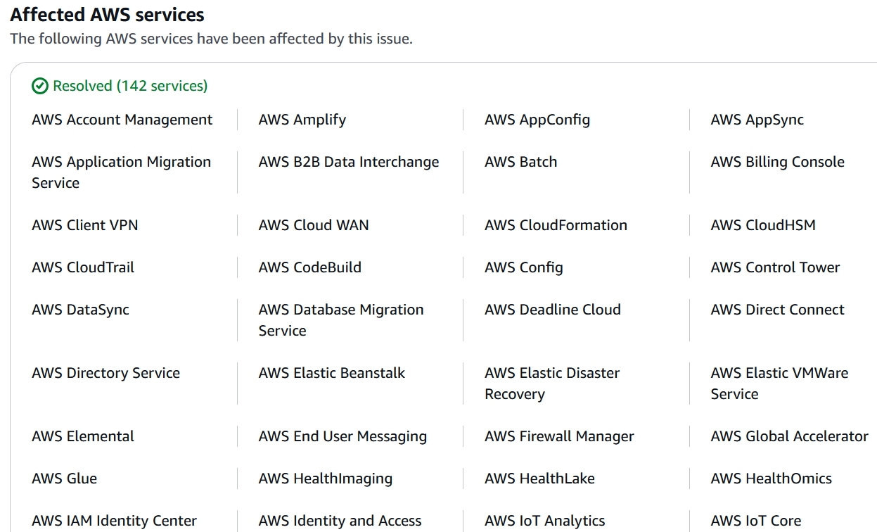 殘餘工作: 雖然服務已恢復,但少數服務 (如 AWS Config, Redshift) 仍有一些積壓的訊息需要數小時才能完全處理完畢。