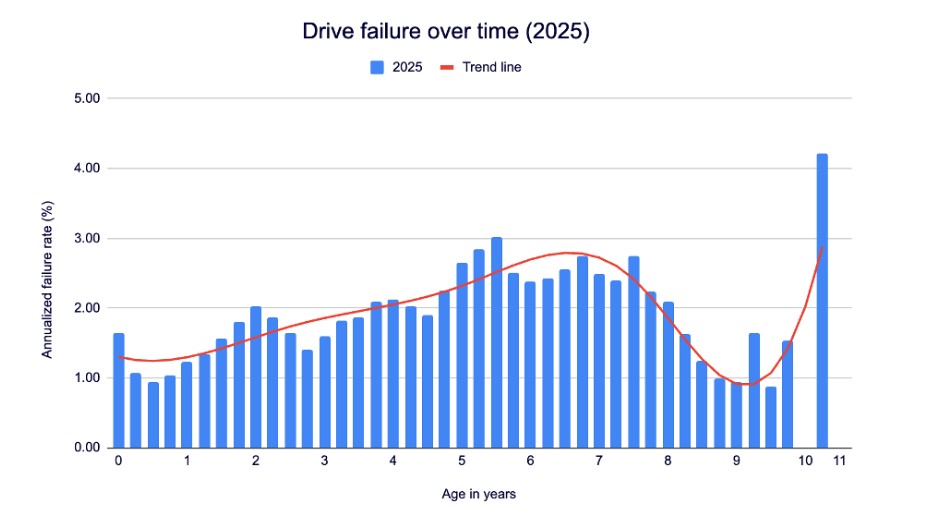 這意味著,許多硬碟在真正進入「耗損期」之前就已經被人為移出資料池。因此,我們在 2025 年的資料中看到的「耗損期」故障率(4.25%)如此之低,是因為大多數硬碟根本沒有機會運作到那個階段。