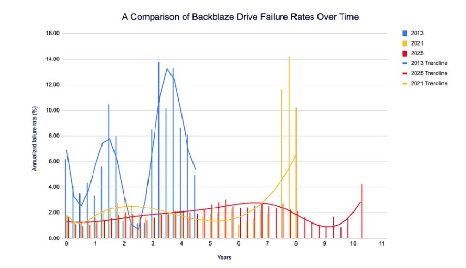 被暱稱為 B2 的 Backblaze ,他們家的報告之所以極具價值,在於其資料的龐大規模與透明度。這次該公司比較了 2013 年、2021 年以及 2025 年(截至 Q2)的硬碟年化故障率(AFR)數據,結果令人驚訝: