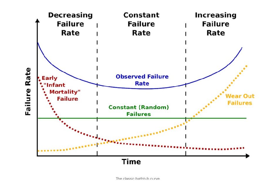 在 IT 基礎架構和可靠性工程領域,「浴缸曲線」(Bathtub Curve)長期以來被奉為圭臬。它描述了硬體設備生命週期的故障規律:初期的高故障率(早期失效),隨後的穩定低故障期(隨機失效),以及最終因老化而急遽上升的故障率(耗損失效)。