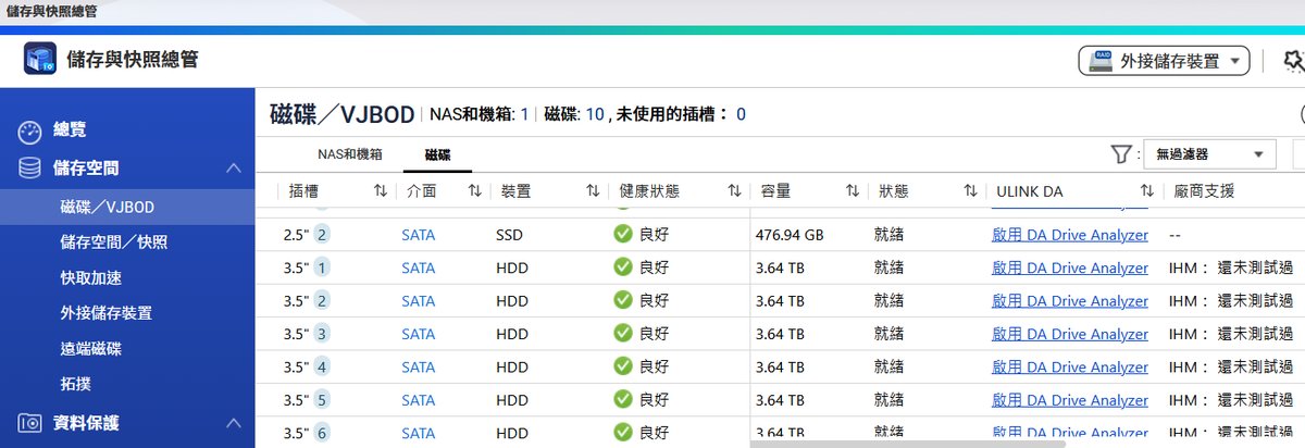 QNAP NAS 的儲存與快照總管(Storage & Snapshots) 管理介面直接整合 DA Drive Analyzer,無需額外安裝或複雜設定。
