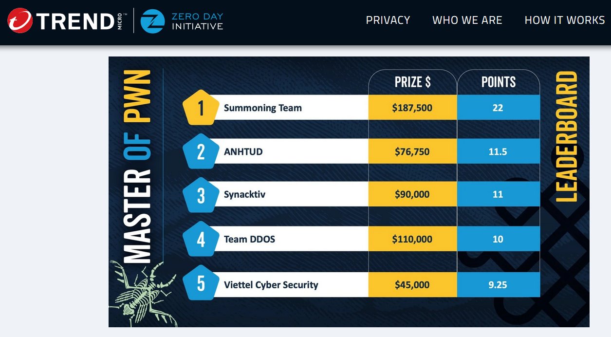 The Summoning Team 以技術實力與多項成功入侵奪得 Master of Pwn,為本屆賽事畫下完美句點。而此次參賽的台灣隊伍有包括戴夫寇爾 (DEVCORE )、奧義智慧 (CyCraft Technology) 在內的團隊,分別在首日和次日都有獎金和積分成績。