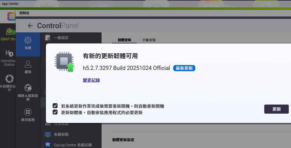 為了提升管理便利性並簡化維護流程,QuTS hero h5.2.7.3297 版本在「控制台」中導入了一項實用的新功能。現在,當使用者執行韌體更新時,系統允許選擇「自動安裝必要的應用程式更新」。這項改進能確保 NAS 在系統升級後,所有關鍵應用程式保持相容並能順暢運作,大幅減少了手動干預的需求。