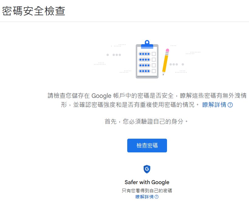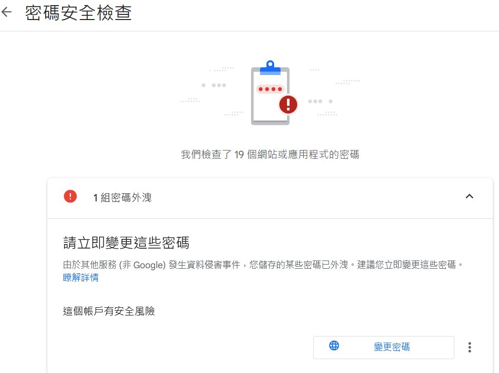 檢視之後,Google 就會提醒你關於個人帳號的一些安全性資訊,如果你在其他平台的密碼有外流事件,這邊也會提醒你,再去做密碼變更等管理,資料來源也都類似,有的則是從暗網蒐集而來,協助大家確認自己的帳號密碼有沒有外流。