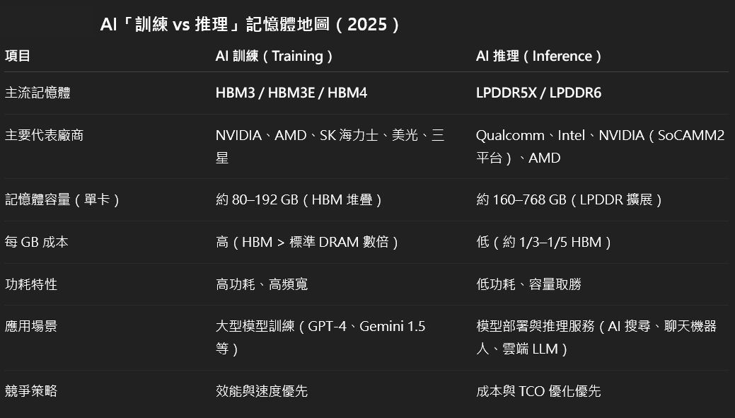在 AI 推理階段,模型權重固定、重點是大容量、可擴充、功耗可控的記憶體子系統。HBM 速度快但成本高、供應吃緊;資料中心若要在 TCO(總持有成本)下做大規模推理擴張,更划算的選項自然會被重新評估。產業分析與多方技術觀察指出,LPDDR 的 $/GB 顯著低於 HBM(常見估值為 HBM 每 GB 成本遠高於 LPDDR/GDDR),這使其在大量部署的推理機群中特別具吸引力。