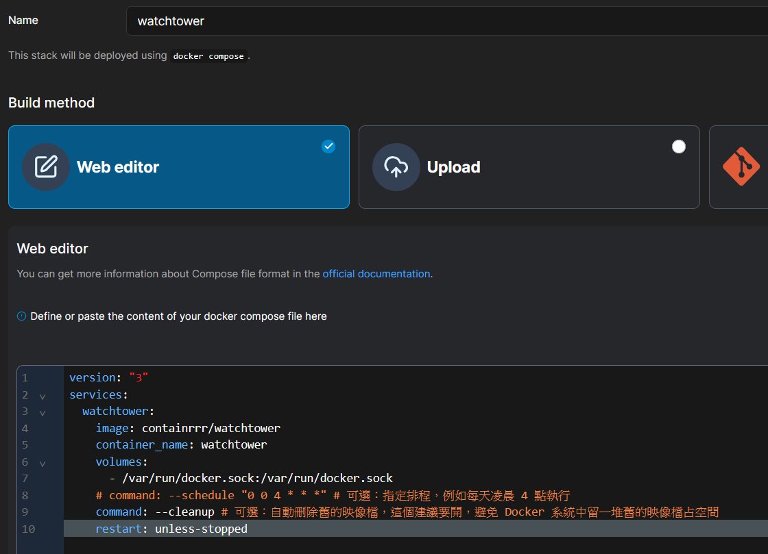 如果有使用視覺化工具或 NAS、Portainer,就可以用下面說明來部署 containrrr/watchtower 。