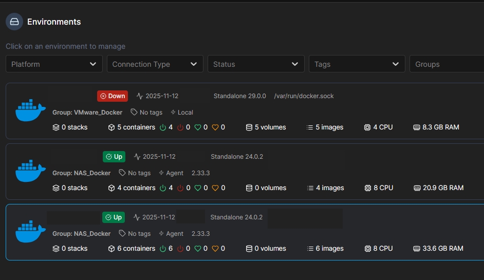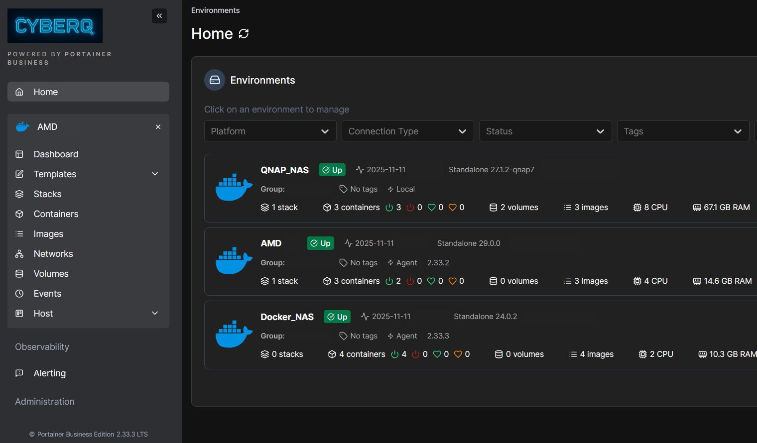 CyberQ 主要的 Portainer 管理平台所在的 QNAP NAS 主機還是 Docker 27.1.2,另一個品牌的 NAS 主機官方容器套件則仍是停留在相對舊的版本 Docker 24.0.2,畫面中這台 CyberQ AMD 測試機是 Linux 主機的 Docker ,則已經更新到 29.0.0。由於主要的 Portainer 執行在 Docker 27.1.2 上,並未受到影響,因此還能管理系統環境中的每個 Docker node。