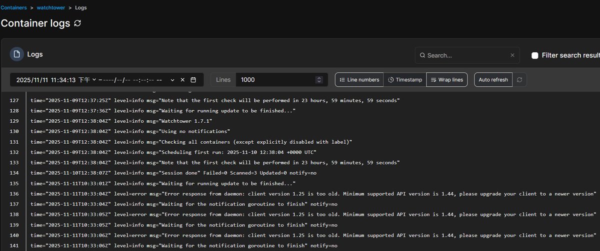 CyberQ 實測在 Docker 29.0.0 的機器上,Watchtower 會顯示 API 版本為 1.25 太舊的錯誤。