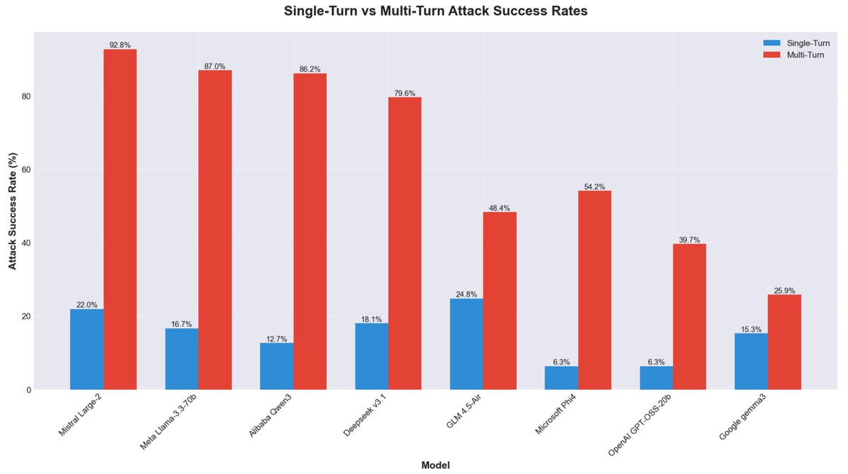 在這種情境下,攻擊成功率從單次互動的低成功率,飆升至百分之九十以上。特別是部分具備高效能推論能力的模型如 Mistral Large-2 與 Qwen3-32B,在面對持續性的誘導對話時,極容易失去判斷力並滿足攻擊者的要求。