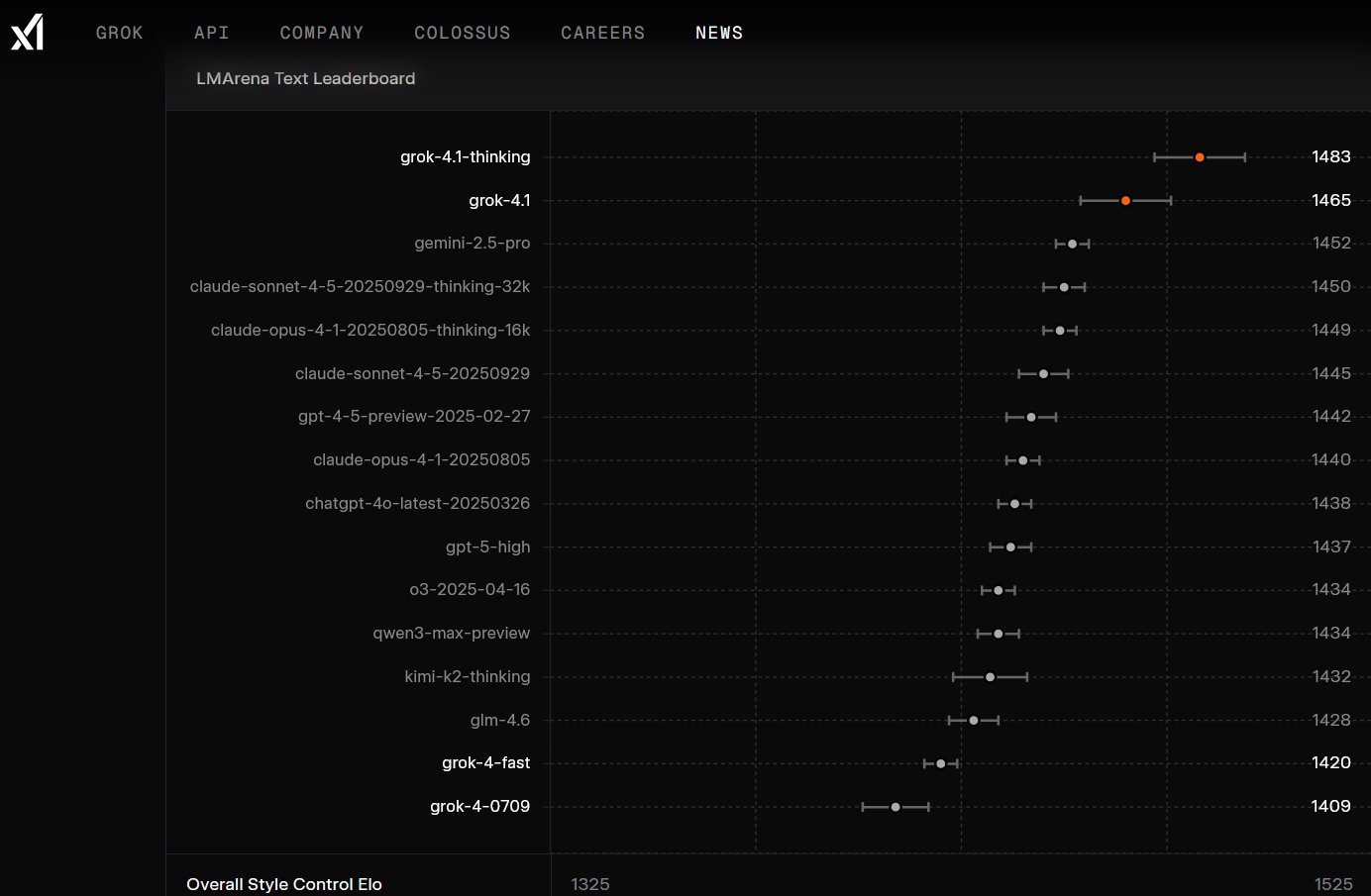 Grok 4.1 在 LMArena 的盲測人類偏好評估中樹立了新標準,代號為 quasarflux 的 Grok 4.1 Thinking 版本以 1483 分的 Elo積分佔據排行榜第一名,領先非 xAI 最高分模型達 31 分之多,而代號為 tensor 的非推理模式版本 Grok 4.1 也以 1465 分位居第二,其表現甚至超越了其他競爭對手具有完整推理能力的模型配置,相較於先前排名第 33 名的 Grok 4,進步幅度相當驚人。