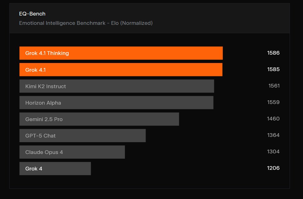 為了衡量模型在個性與人際互動上的進步,開發團隊使用 EQ-Bench3 對 Grok 4.1 進行了評估,這是一項由大型語言模型擔任評審的測試,旨在檢驗模型的情感智商、同理心與人際技巧。