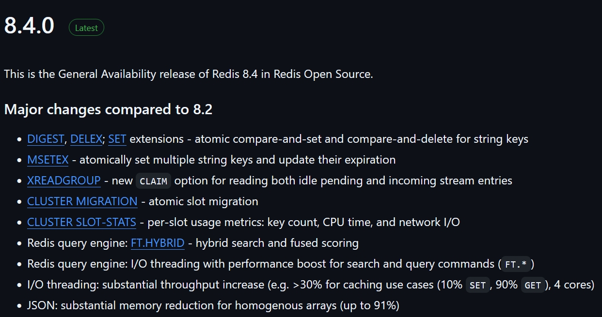 在經歷了 Redis 8.0 回歸開源(BSD 授權)的熱烈討論後,Redis 官方團隊並沒有停下腳步,最新的 Redis 8.4 社群開源版本已經釋出。