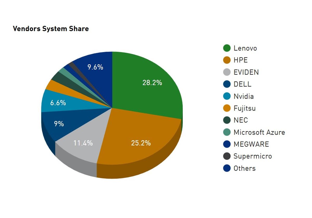Lenovo(聯想):在入榜系統的總數量上持續領先。憑藉著強大的商業伺服器通路與 ThinkSystem 產品線,聯想在全球企業與學術機構的通用運算市場中佔有極高比例。