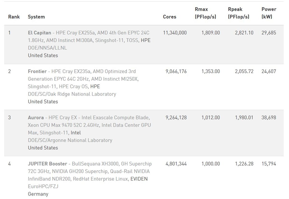 美國包辦前三名,歐洲首台突破 Exascale 門檻拿第四名