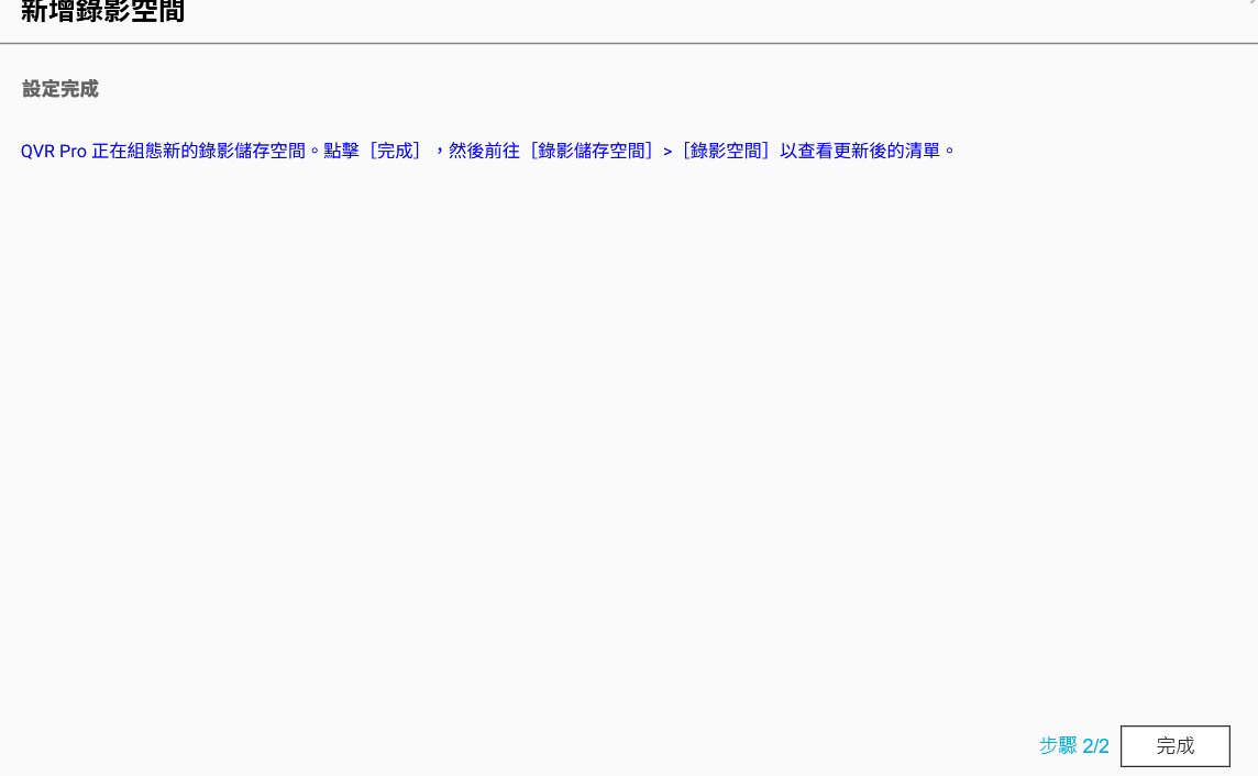 在成功完成錄影空間的配置,如上圖,系統會提示進行備援磁碟區和攝影機設定,如下圖。這個步驟非常關鍵,它確保了影像資料的第一手儲存,並且為攝影機的加入做好了準備。圖中顯示 Space1 已成功就緒,總容量 5.61 TB,所有資料都將安全地保留在我們在本地端的 NAS 上。