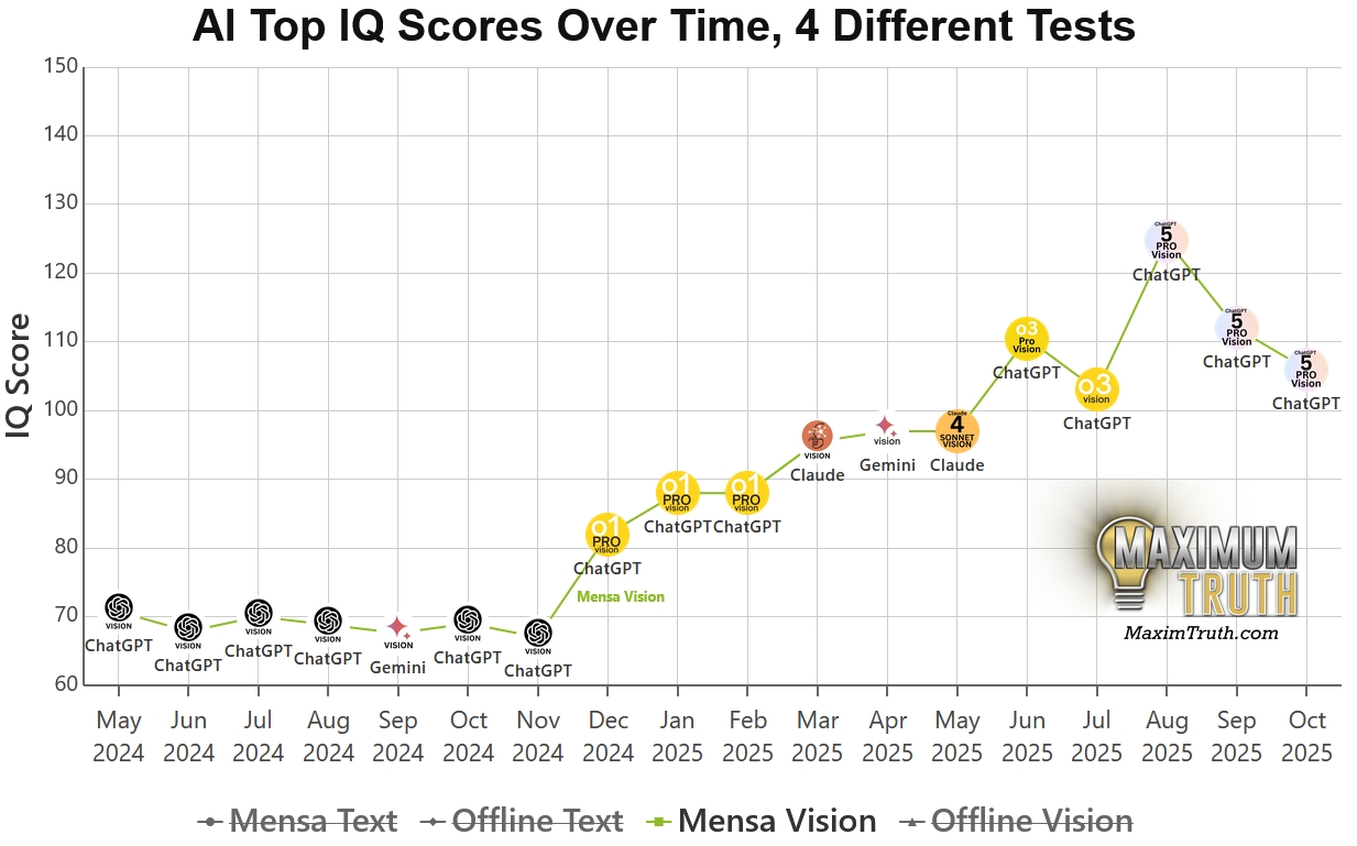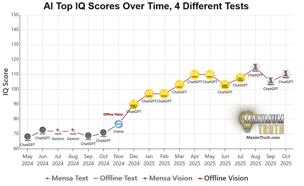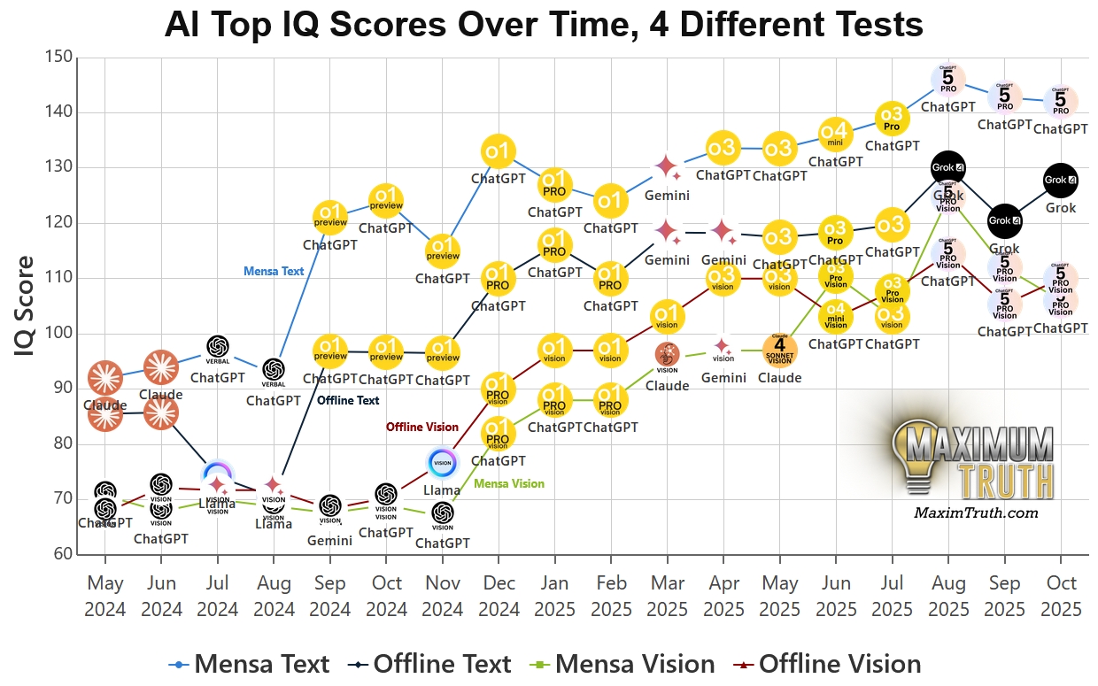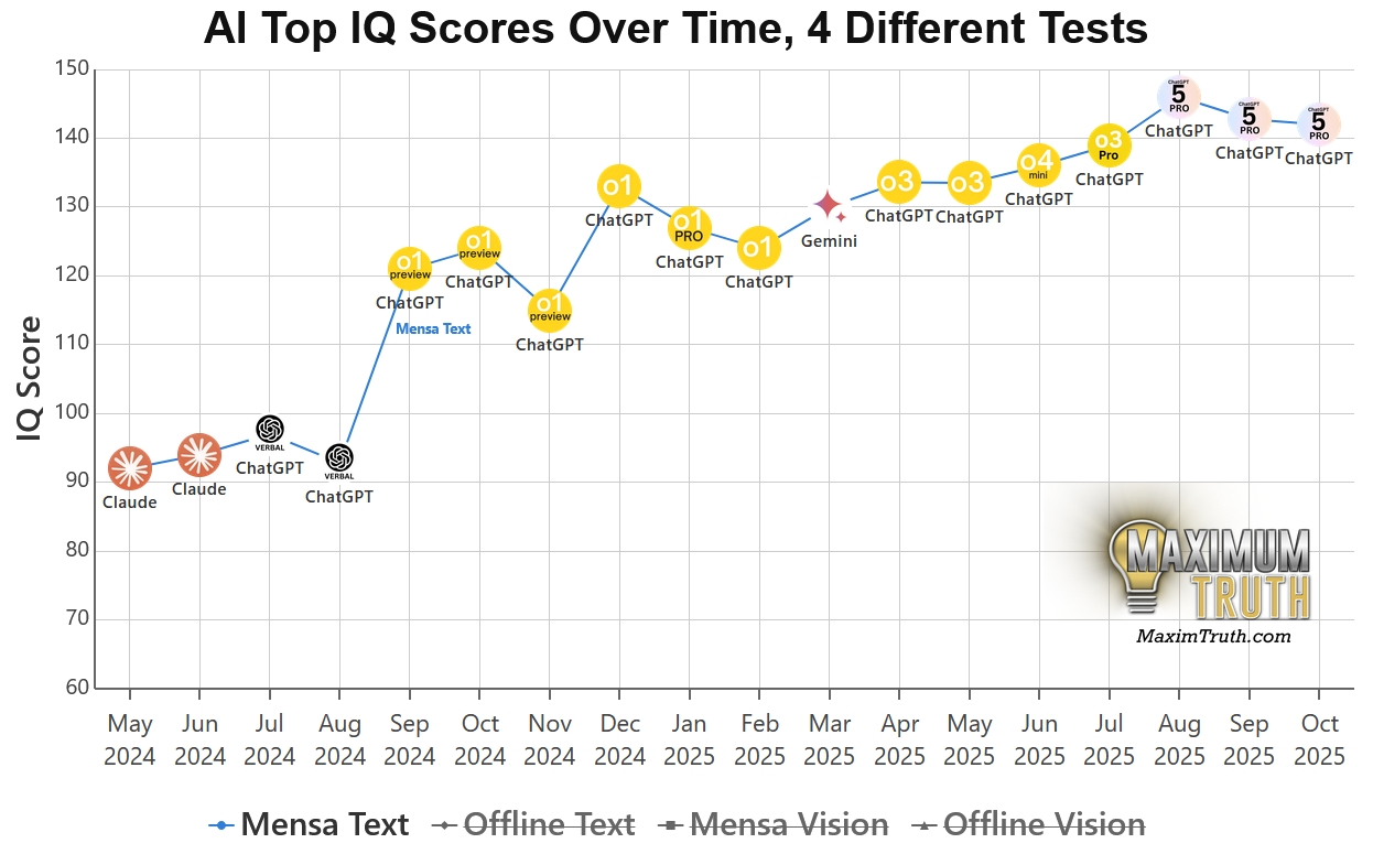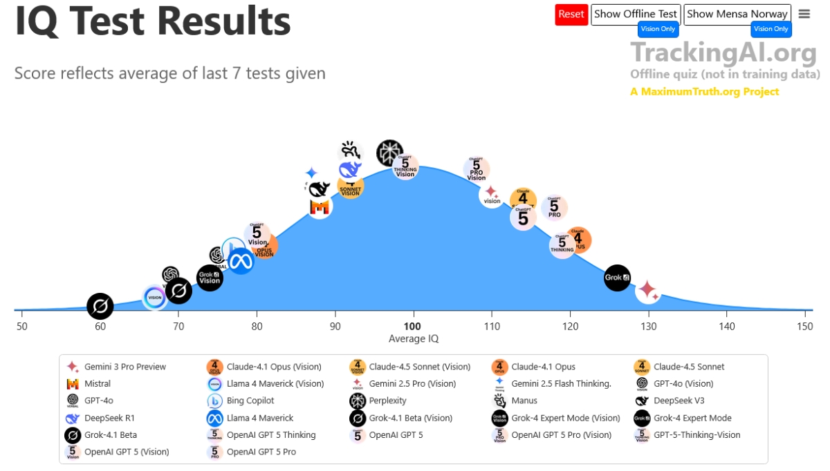 刷題疑雲: 相比之下,榜單上部分模型出現了令人尷尬的分數落差,比方說著名的 GPT-5 Pro ,它在公開的 Mensa 測試中狂飆到 148 分(接近天才級別),但在沒見過題目的「離線測試」中卻回落至 116 分。