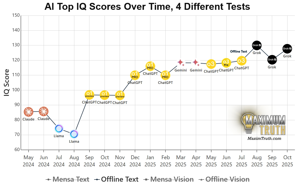 如果一個 AI 只能解決它「看過」的問題,以及努力接話你給它的文本,那它充其量是一個超強的搜尋引擎。但當 Gemini 3 Pro 在未知題目上拿下 130 分時,xAI Grok 4 也拿到 IQ 126 分暫居第二名,我們或許正見證著 AI 從接話強者 + 檢索整理資料者,走向思考者跨越的關鍵時刻。