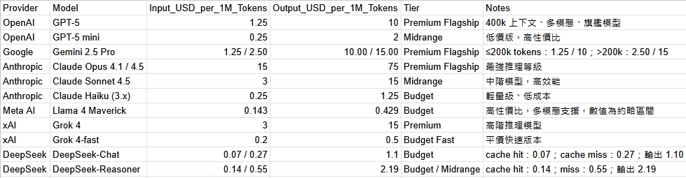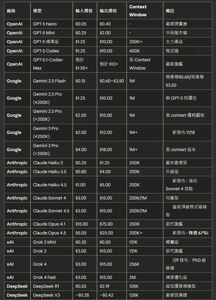 主要 AI 模型 API 價格比較 (2025年11月版)