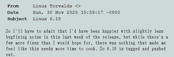 隨著 6.18 的塵埃落定,Linus 也提前揭露了下一個版本 Linux 6.19 的特殊時程。由於接下來將碰上年度核心維護者高峰會(Kernel Maintainer Summit)以及歐美的聖誕與新年假期,Linus 預告 6.19 的開發週期將會稍微拉長。