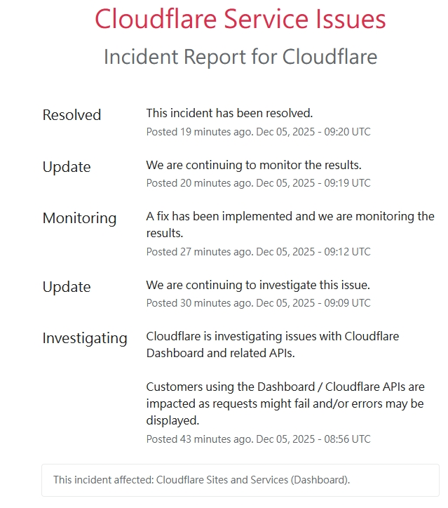 事件名稱: Cloudflare Dashboard and Cloudflare API service issues(Cloudflare 儀表板與 API 服務異常)