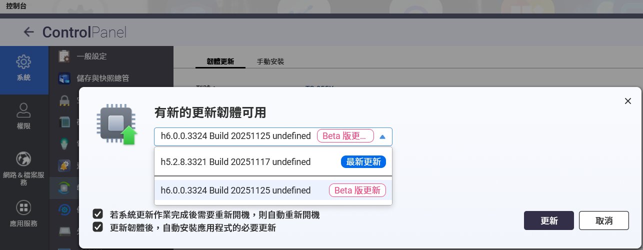 如果你追求極致穩定,或是你的生產環境尚未準備好迎接 h6.0.0 的架構變動,QNAP 同步釋出了 h5.2.8.3321 版本與 h5.3.1.3292 版本。