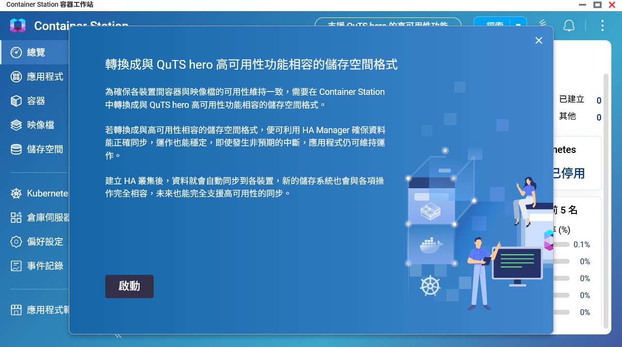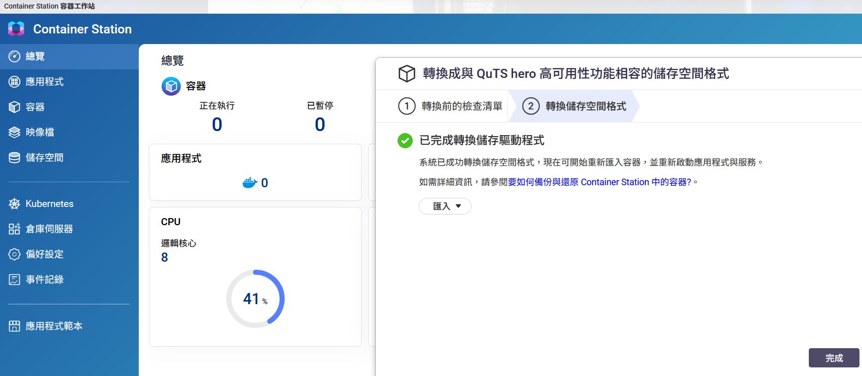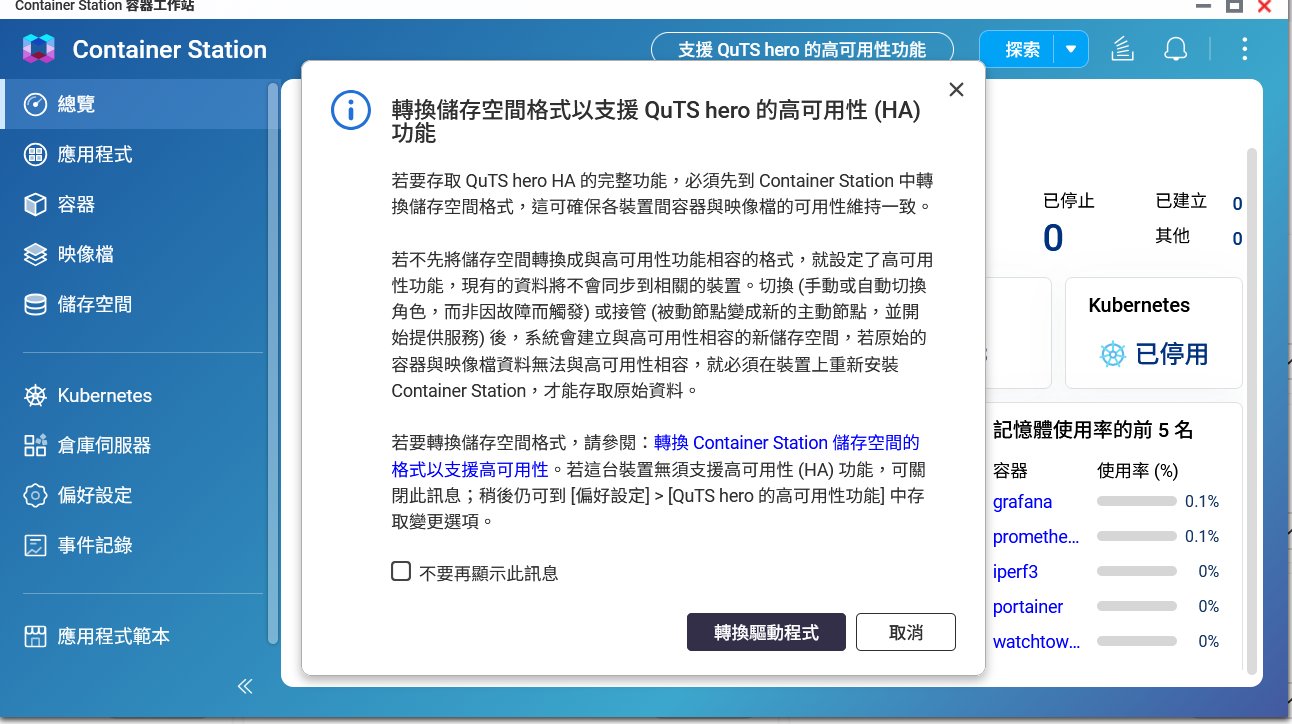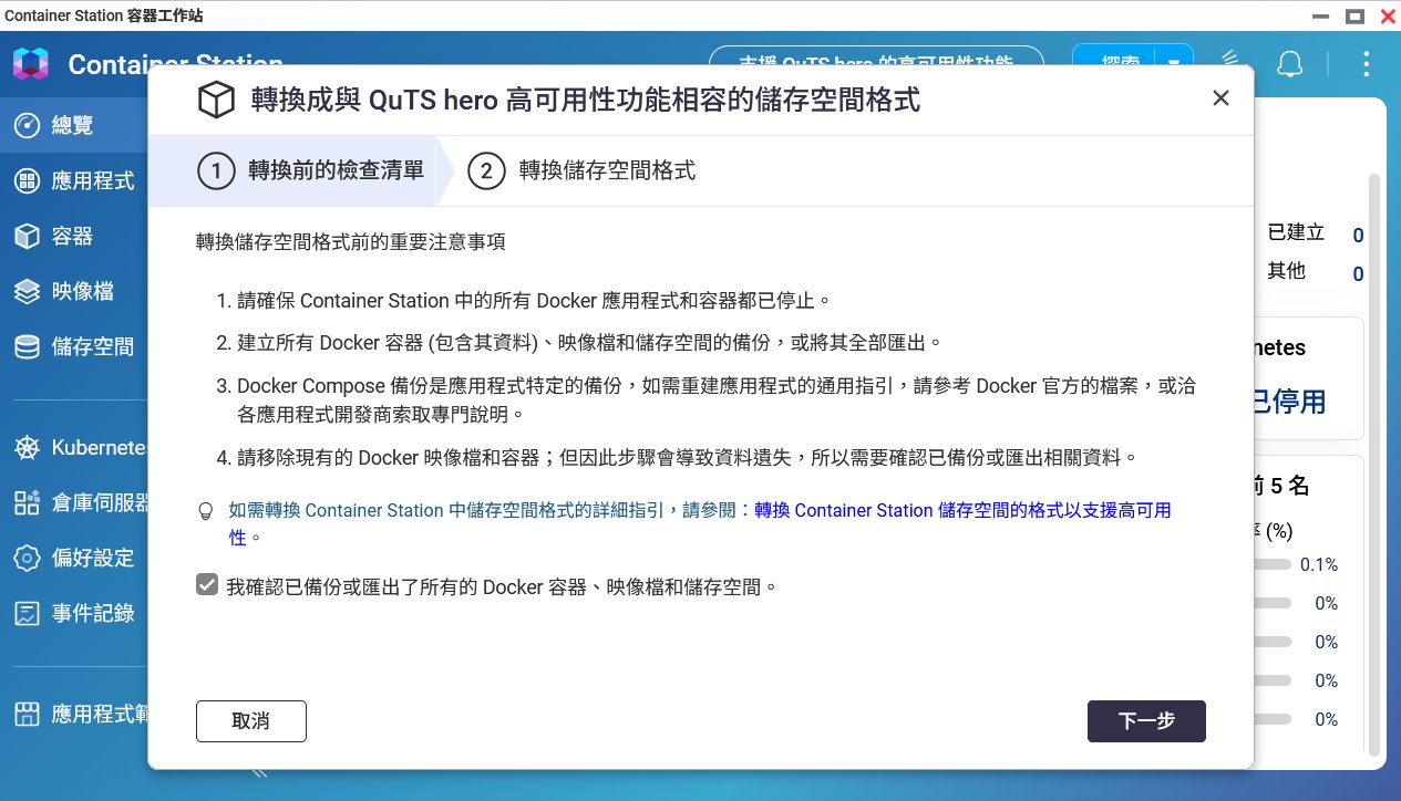 像是上圖的容器工作站,它如果進行容器儲存空間格式的升級,就得移除掉已經運作中的容器,所以需要把容器設定檔案備份,升級之後再導入回來才能用,但如果不升級這個容器格式到新版,那就沒有差,繼續用也可以。