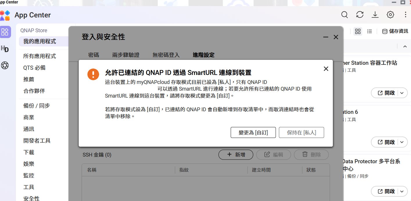 如果有使用 QNAP ID 登入的,記得在這邊也要設定一件重要的事情是,請儘量保持在私人存取模式,如果你需要有給不同 QNAP IP 團隊協作登入你的 NAS ,相關安全性設定要設好。