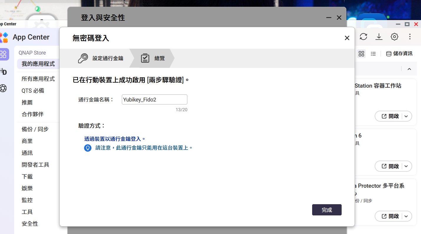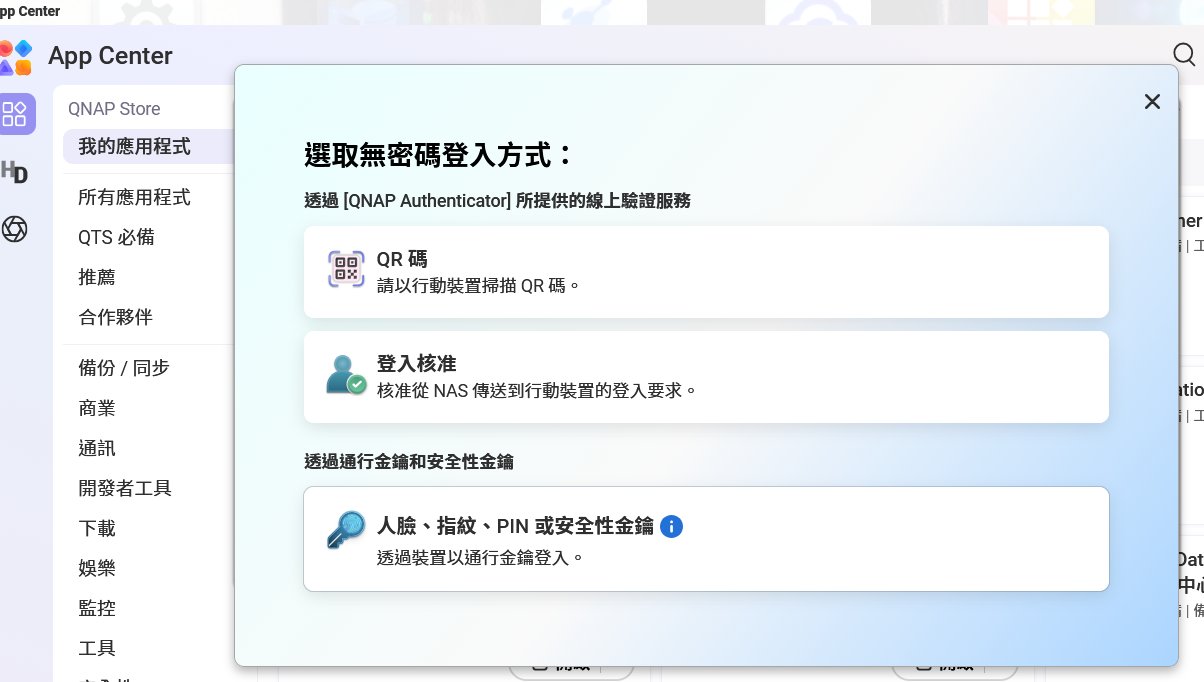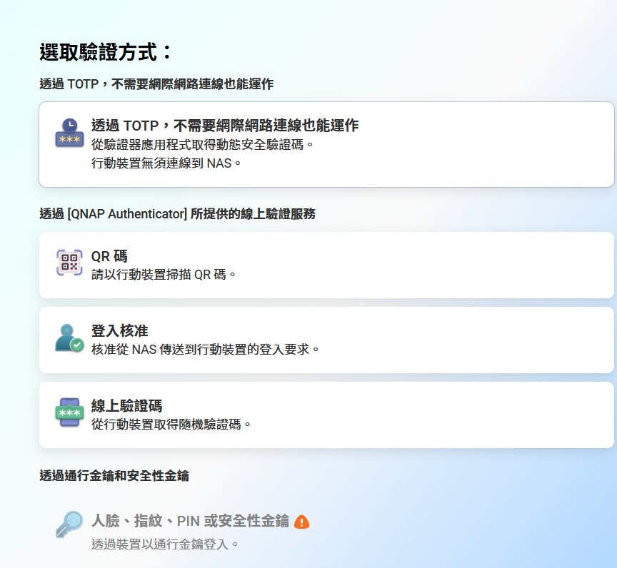 都設定好之後,我們連線 QNAP NAS,就可以看到支援 FIDO 的登入方式納入