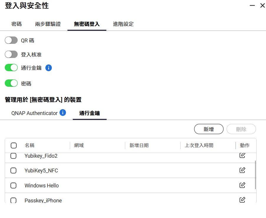 下圖的實測中,CyberQ 綁訂了 4 個無密碼登入的裝置,有手機,有二個實體安全金鑰,有一個Windows商務筆電Hello攝影機刷臉,確保萬無一失,另外也可以去多設定一個 QNAP 驗證器,需要裝APP搭配使用。