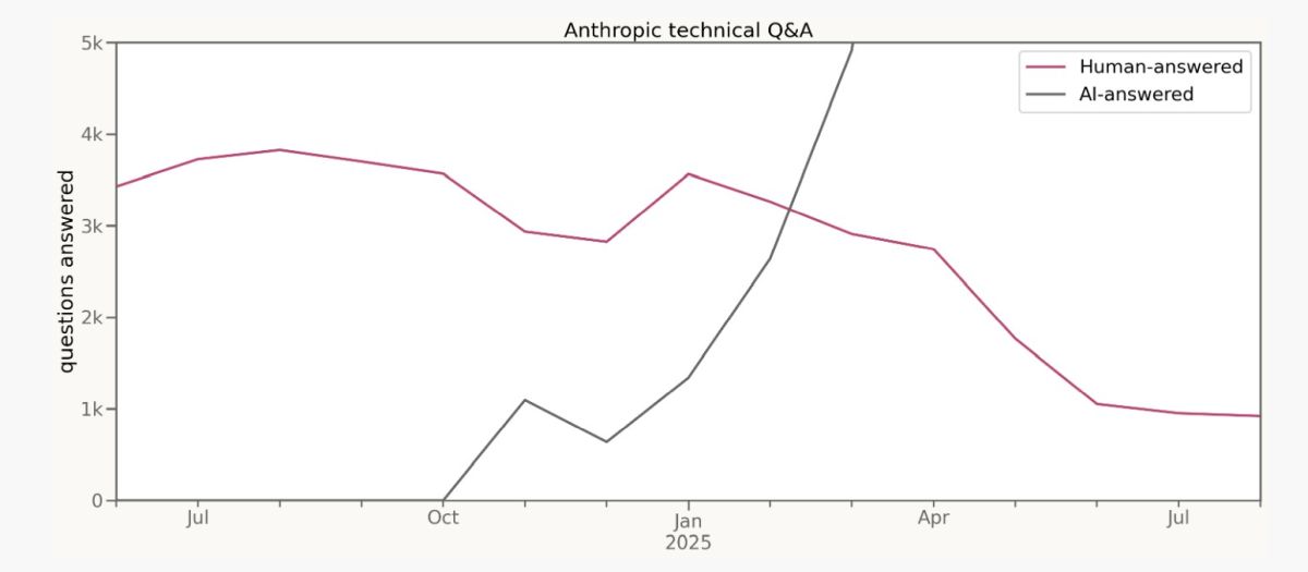 最引人深思的還是 Andy Jones分享了他在 AI 重要廠商 Anthropic 的真實經歷。作為該公司最早聘用的研究員之一,他在 2024 年的主要工作內容是回答新進員工的技術問題,當時每個月需要處理大約 4,000 個問題。然而,隨著自家模型 Claude 的迭代更新,在 2024 年 12 月出現了變化,Claude 突然開始具備了回答這些問題的能力。