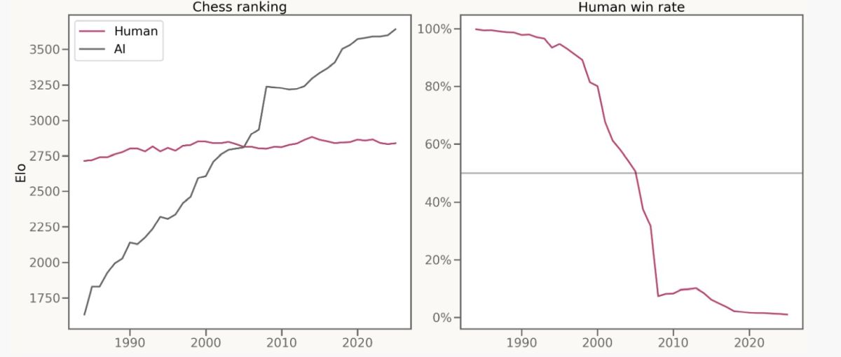 Andy Jones 接著提到,人類從1985年起開始追蹤電腦西洋棋的 Elo 等級分,發現往後的四十年間,電腦棋力每年穩定地提升50分。在2000年時,一位人類頂尖棋手面對電腦仍有九成的勝算。然而僅僅過了十年,同一位棋手面對電腦的勝率就突然崩跌至一成以下。這再次印證了,電腦棋力的進步是線性的,但超越人類的轉折點卻是突然發生的。