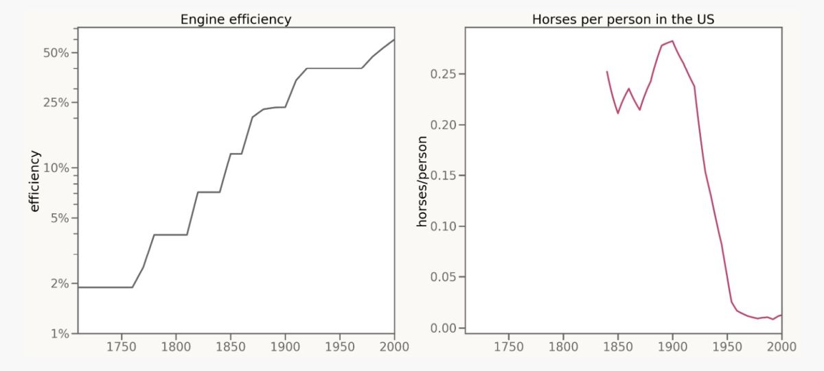 Andy Jones 首先以工業革命時期的蒸汽引擎為例。蒸汽引擎自西元 1700 年發明後,在接下來的二百年裡,效率以每十年提升 20% 的速度穩定成長,同時,如果去細看,其實在最初的一百二十年裡,這種蒸汽引擎帶動的新技術對於當時的主要動力來源「馬」來說似乎毫無影響。