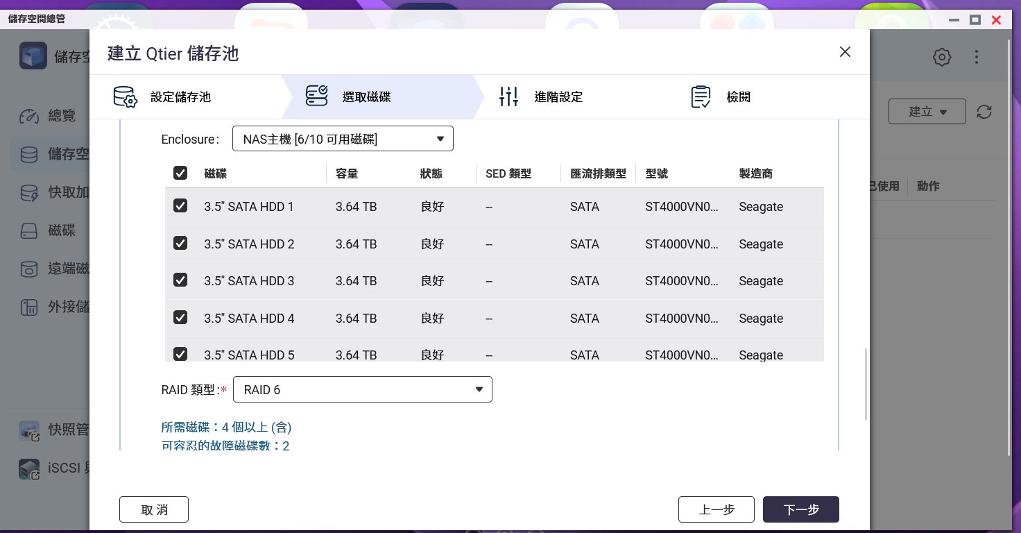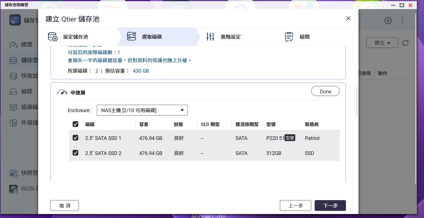 Qtier 儲存池的資料保護仰賴各層級的 RAID 配置。與 SSD 快取不同,Qtier 的 SSD 層存放的是資料本體,因此務必為 SSD 層配置適當的 RAID 保護,所以我們設定 RAID 1 ,意思就是萬一掛掉一個 SSD,你再去換一片上來更換即可,資料不會掉。本範例的 RAID 1 + RAID 1 + RAID 6 共三層的組合,可在效能與安全性之間取得良好平衡。