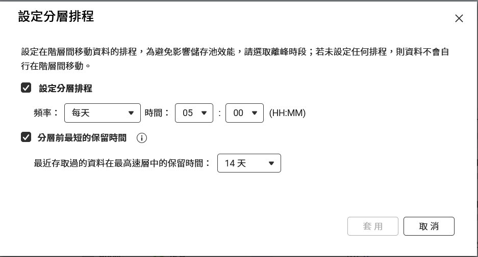 由於 Qtier 不是隨時都在搬移資料,那樣反而會影響效能,所以需要設定「自動分層排程」(例如設定在半夜 2:00 – 6:00 進行),讓 NAS 在閒置時整理資料,自動將資料分層。