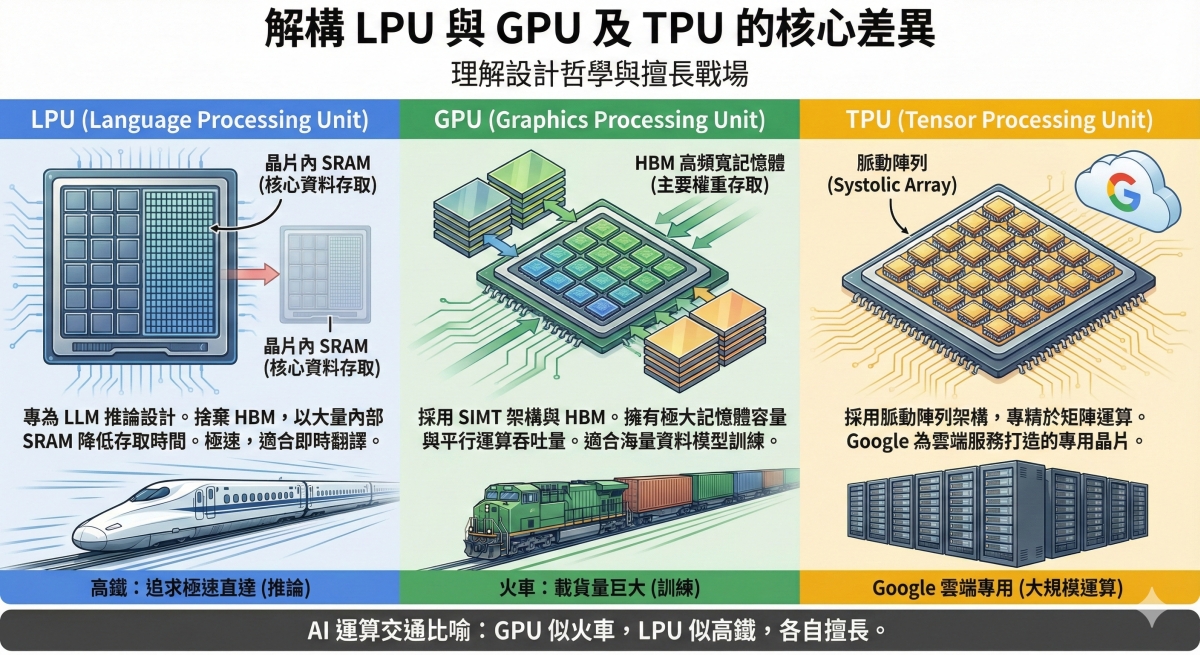 要理解這項交易的重要性,必須先釐清 Groq 開發的 LPU 與傳統 GPU 及 Google TPU 在設計哲學上的根本差異。這三者雖然都用於 AI 運算,但其核心架構決定了各自擅長的戰場。
