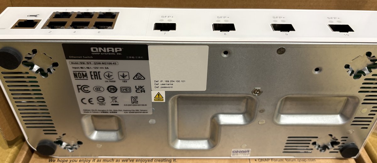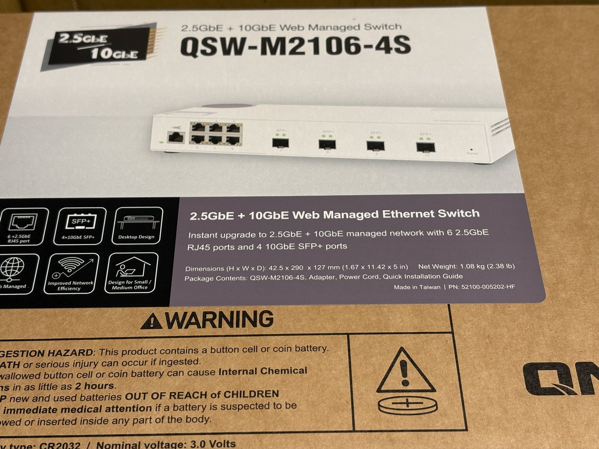 QSW-M2106-4S 的包裝一如 QNAP 品牌提供既往的簡潔再生紙外盒,盒裝上大大的標示著「2.5GbE + 10GbE」,這正是它的核心價值所在。對於大多數環境來說,全面更換 10G 設備成本過高,但保留 1G 又太慢,這台交換器與同系列相關機型 (具備更多連接埠) 提供了一個絕佳的平衡點。