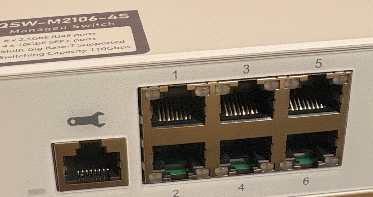 如果家裡的 NAS 提供的是 10 GbE 連接埠,或電腦的網路卡也是非 SFP+ 規格的,那麼 QSW-M2106-4C 同樣提供共 10 埠的連接,但是改成含 4 個 10GbE SFP+ (光纖)/ RJ45 (銅纜) 複合埠及 6 個 2.5GbE RJ45 埠,就不用煩惱要去買電口轉光口的轉換模組了,對線材或規格有疑問可以看這一篇 升級 10GbE 需要的網路卡、SFP+ 模組與線材選購到 iPerf3 實測全攻略。