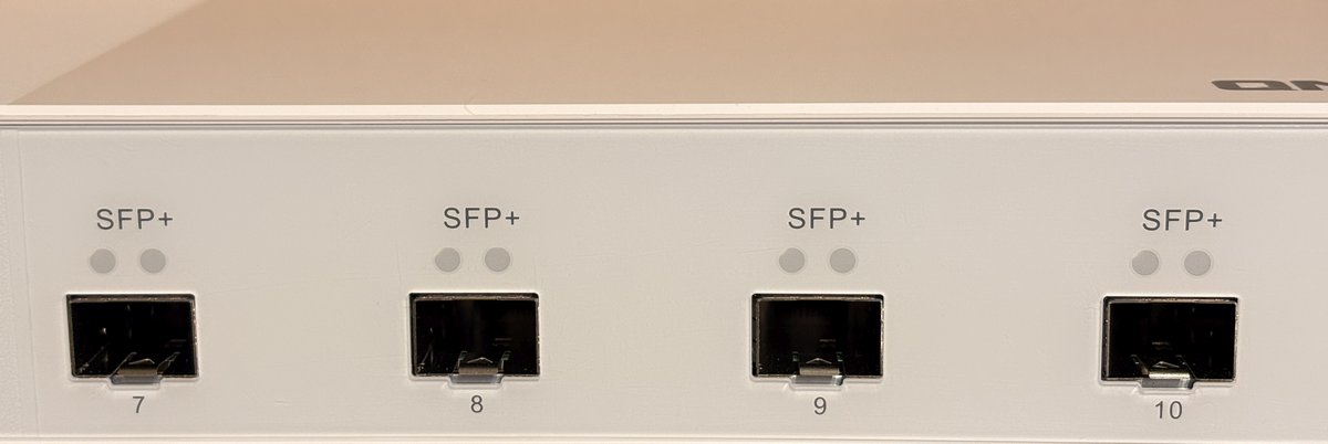 而右側則是重頭戲,4 個 10GbE SFP+ 光纖埠。這 4 個高速通道正是打造「核心骨幹」的關鍵,無論是用來連接 QNAP NAS、虛擬化伺服器,還是透過 DAC (Direct Attach Cable) 進行堆疊串接,都能提供毫不妥協的頻寬。