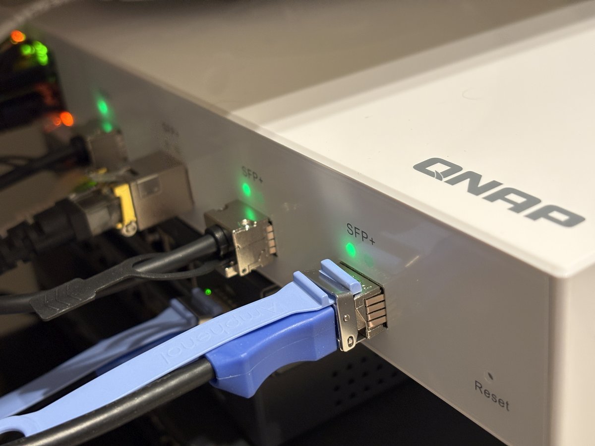 最後,讓我們看看實際部署的狀況。將 SFP+ 插滿 DAC 線材與光纖模組後的 QSW-M2106-4S 展現了其專業的一面。