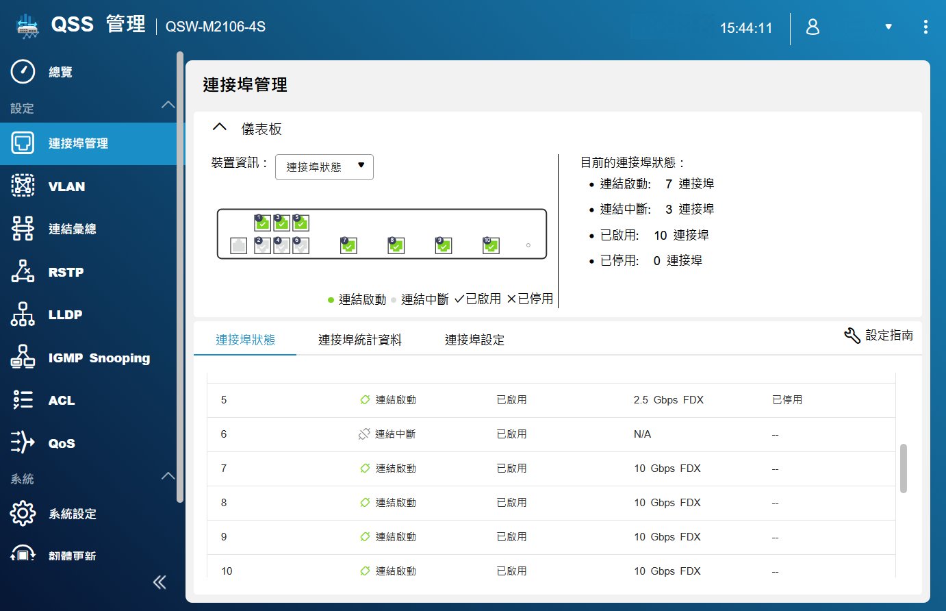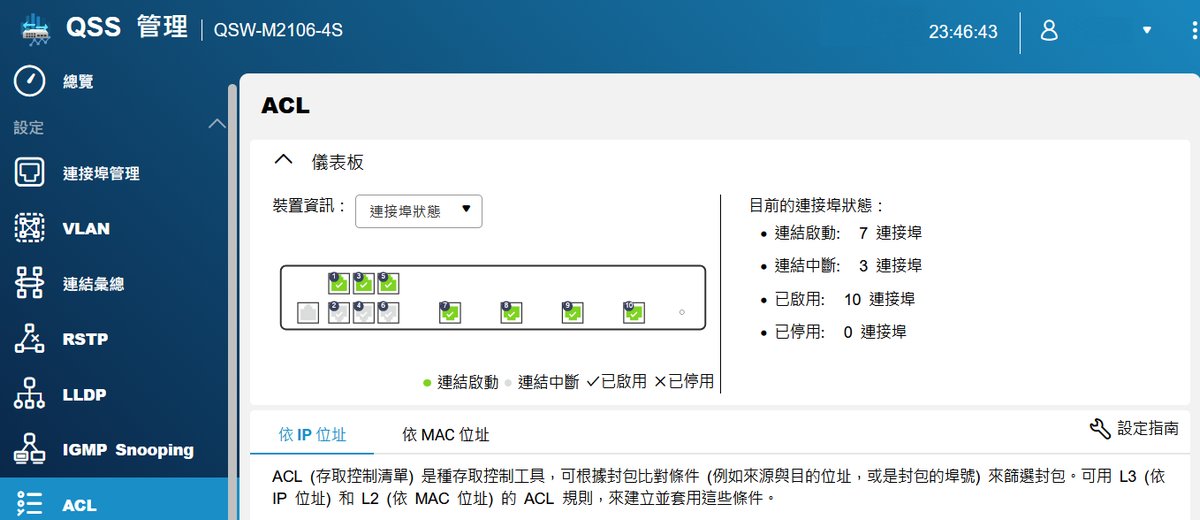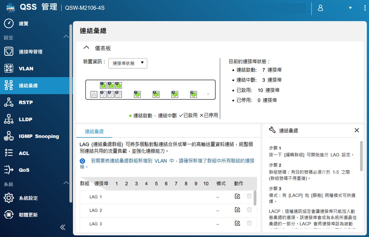 登入後,首先映入眼簾的是簡潔的儀表板。從截圖中我們可以看到目前的連接埠狀態。透過顏色區分連線速度(綠色代表高速運作中),管理者可以瞬間判斷哪些設備正跑在 10GbE 全速(如 Port 7-10),哪些設備則運行在 2.5GbE(如 Port 5)。這種可視化的設計,對於排查實體線路問題非常有幫助。