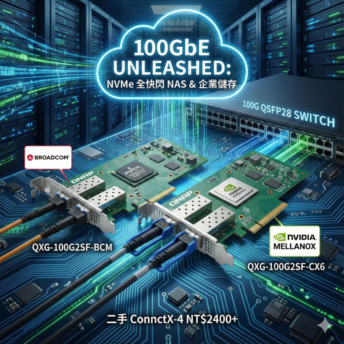 最近,QNAP 發表推出了採用 Broadcom 晶片的全新 100GbE 網卡 QXG-100G2SF-BCM,這在原本以 NVIDIA (Mellanox) 和英特爾晶片為主流的高階網卡市場中是更省電和合理成本和效能組合的新澤。今天我們就藉由這張新卡,來聊聊現在 100GbE 的市場生態、二手網拍樂趣,以及企業建置的一點眉角。