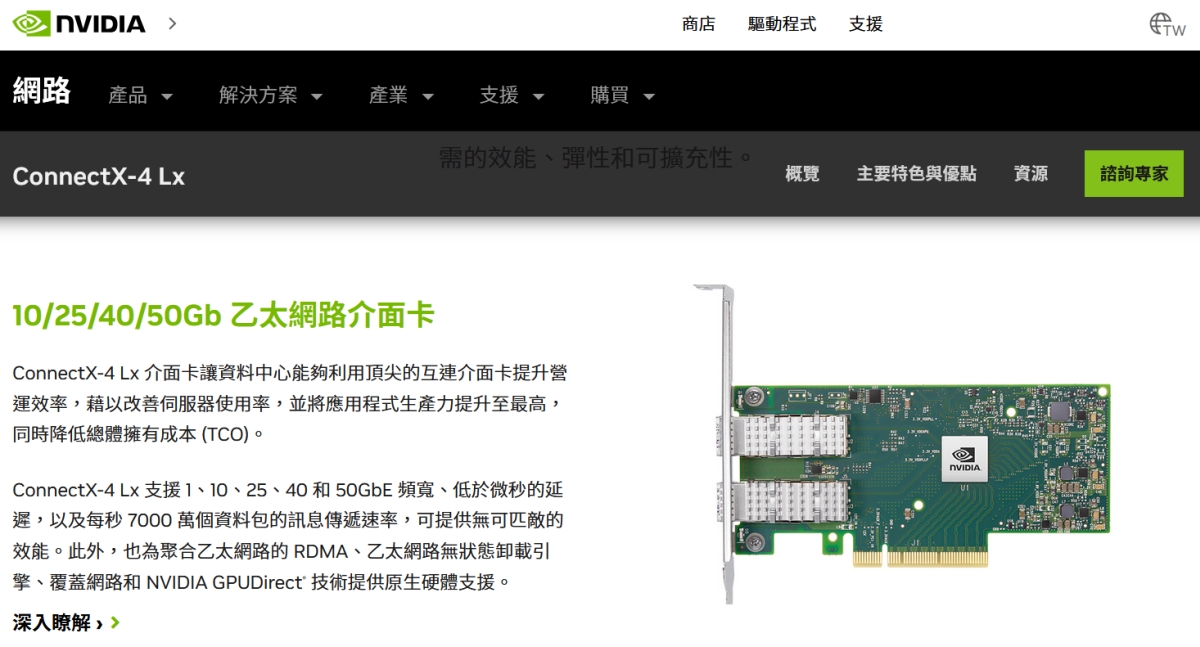 | 主要優勢 | 極致 CP 值 Linux 支援度極高,適合練功與中小企業、Home Lab 環境。 | 低延遲與 AI 加速 硬體卸載強大,支援 NVMe-oF 與加密加速,HPC 首選。 | 穩健相容性 x86 生態系相容性佳,驅動程式需留意確認,企業長期維運用。 | 高吞吐生態系 搭配 Broadcom 交換器整合性佳,SR-IOV 虛擬化效能優異。 |