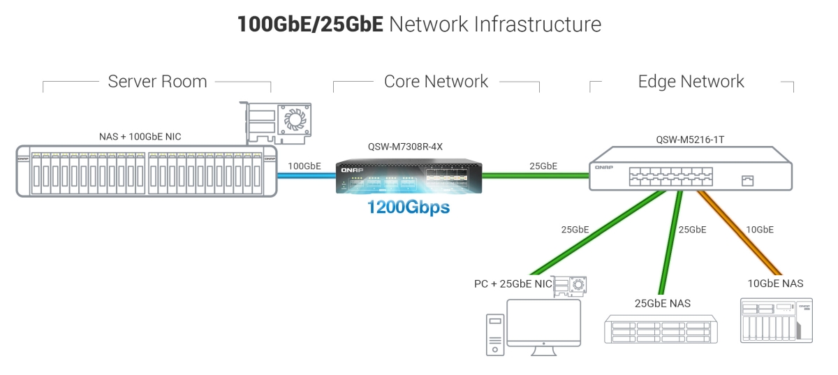 100GbE 交換器 (Switch) 會需要採購需要支援 QSFP28 介面的產品。以 QNAP 來說,他們自家有推出搭配的 QSW-M7308R-4X(支援 100GbE) 去搭配 QNAP 一系列高階 NAS 與前面提到的三種晶片 100 GbE 網路卡來使用,這類產品通常價格不菲,是建置成本中佔比最高的一環。