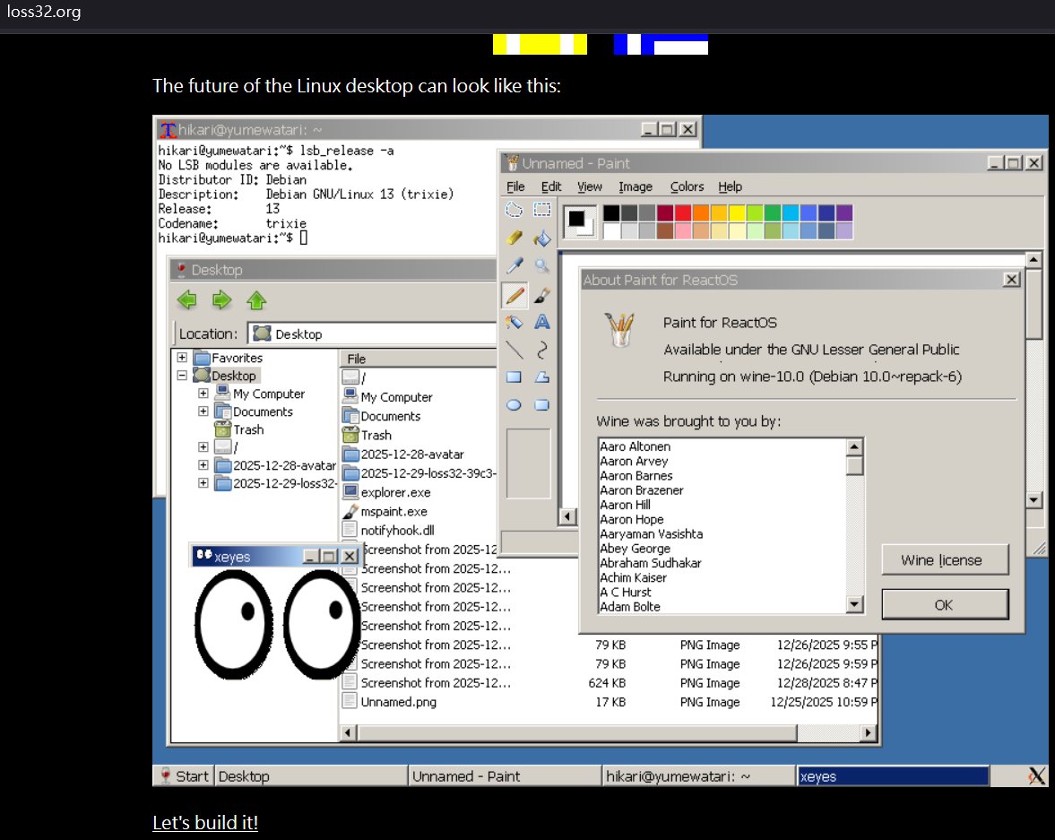 在這個構想中,沒有傳統完整的 GNU userland,而是極度精簡的 userspace,甚至整個桌面環境都執行在 Wine 內部,整個 OS 的目的就是為了直接執行 Windows 二進位檔案。這聽起來像是 25 年前 Lindows(後來改名 Linspire 和 Freespire,早期即有類似 Click’n’Run Warehouse 的應用程式商店)的「精神續作」,但在 2026 年的技術背景下,這已不再是天方夜譚。相較於其他類似專案,如 Longene(試圖將 Windows 二進位支援直接加進 Linux 核心)、ReactOS(開源 Windows 模擬器,曾考慮類似方法)或 Neptune OS(仍在開發中),Loss32 更專注於 Wine 的整合。